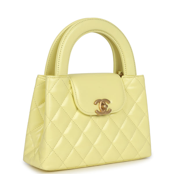 Buy Chanel Small Kelly Yellow Shiny Aged Calfskin Brushed Gold Hardware. This small Kelly Shopper is in yellow shiny aged calfskin with brushed gold hardware, tonal stitching, two flat back top handles, interwoven brushed gold and a White leather shoulder strap, and the signature CC turnlock closure. The interior is lined with yellow leather and has one zipper and one slip pocket.