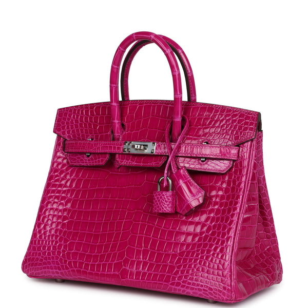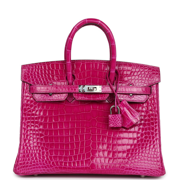 Buy Hermes Birkin 25 Rose Sheherazade Shiny Porosus Crocodile Palladium Hardware. This Birkin is in Rose Sheherazade shiny Porosus crocodile leather with palladium hardware and has tonal stitching, front strap, two straps with center toggle closure, clochette with lock and two keys and double rolled handles. The interior is lined with  Rose Sheherazade chevre and has one zip pocket with an Hermes engraved zipper pull and an open pocket on the opposite side.