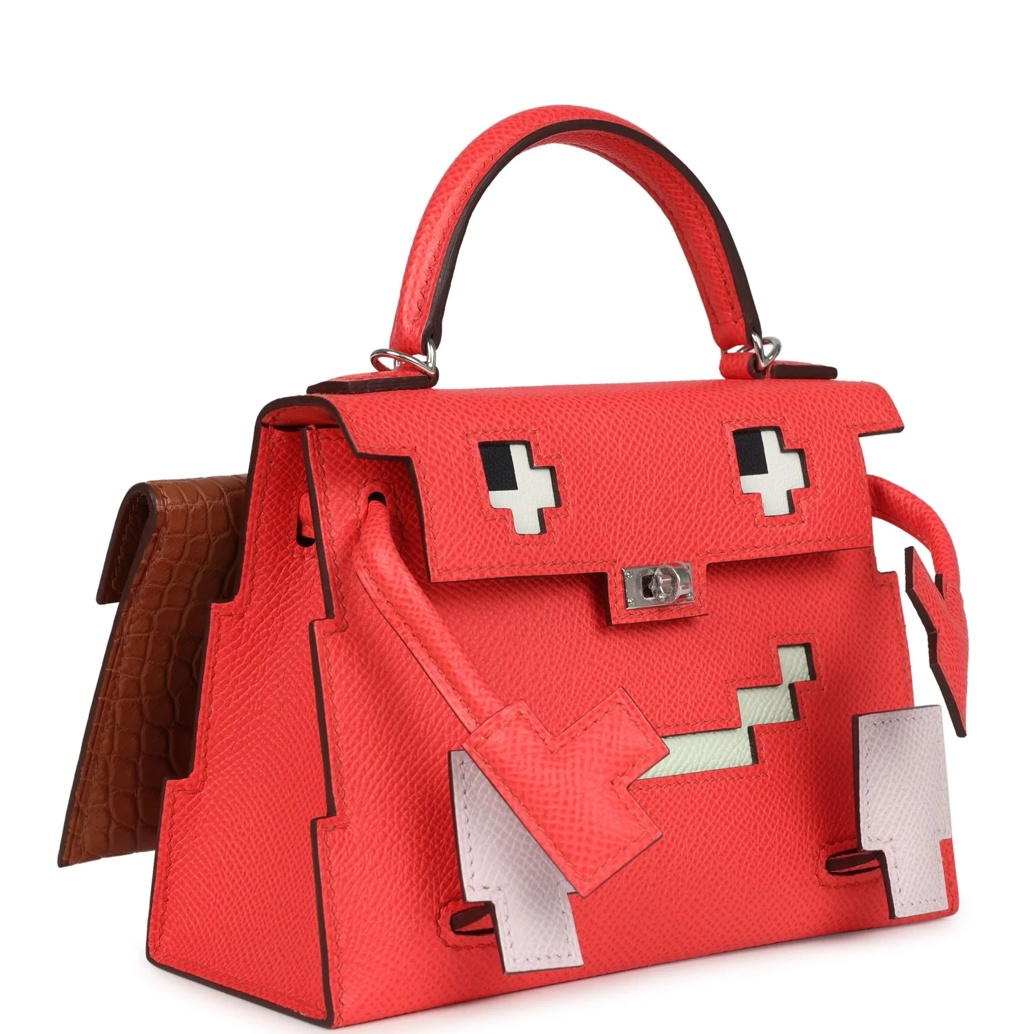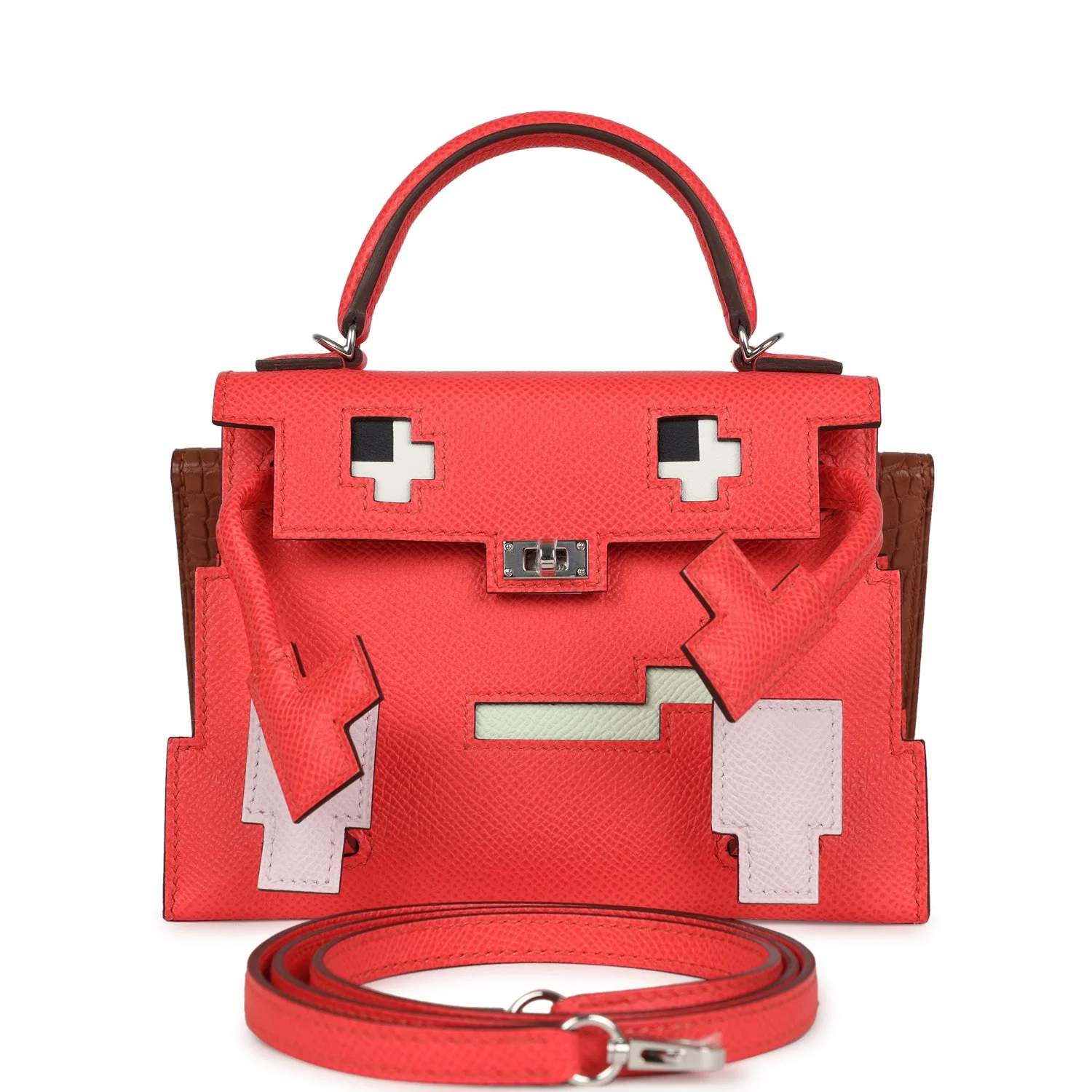 A rare Hermès Quelle Idolle Picto Kelly Doll in Rose Extreme, Mauve Pale & Craie for sale. Features mixed exotic leathers, whimsical design, and palladium hardware. A playful Hermès collectible.