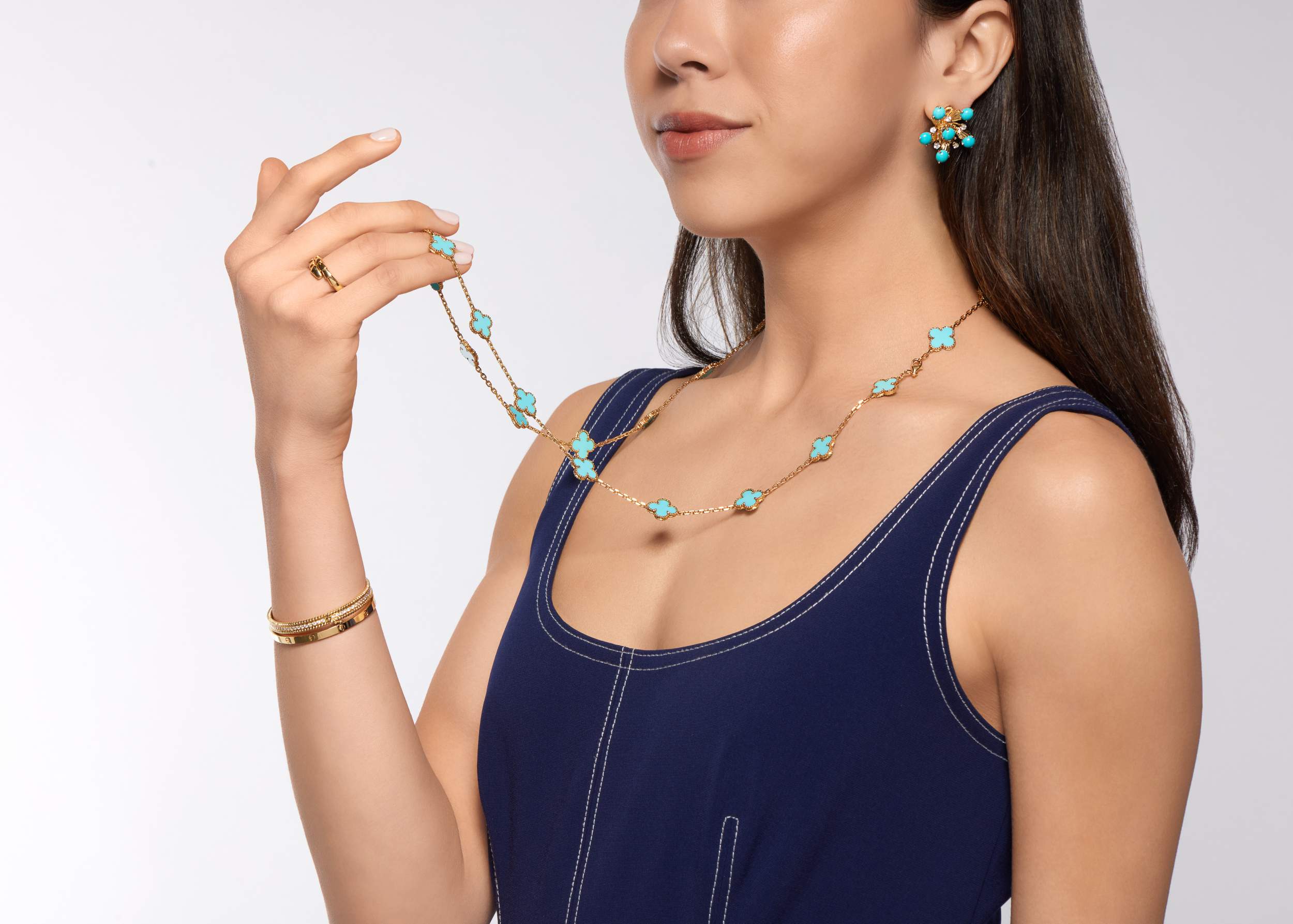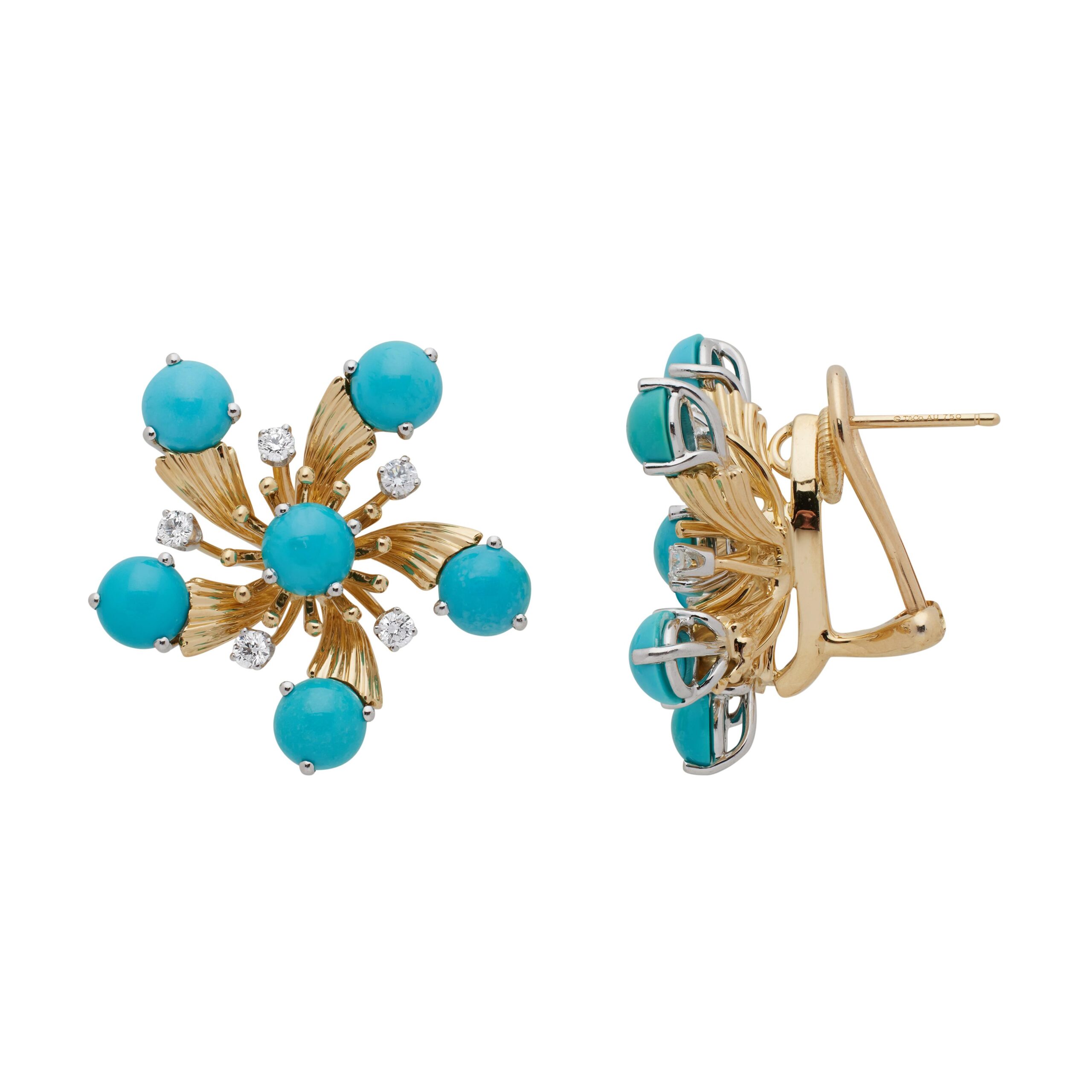 Luxurious Tiffany & Co. earclips in 18k gold and platinum with turquoise cabochons and brilliant diamonds. A refined choice for women’s evening and cocktail wear