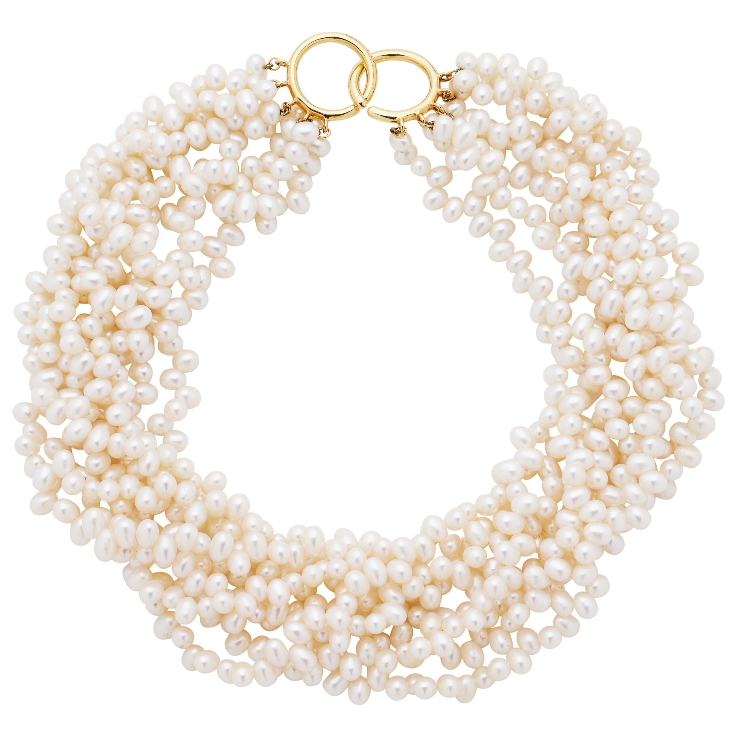 Discover timeless elegance with this vintage Tiffany & Co. multistrand collar necklace, designed by Paloma Picasso. Featuring eight luminous strands of 6.00 x 5.00 mm cultured pearls, this statement piece is finished with a distinctive 18k yellow gold interlocking clasp. Signed by Tiffany & Co., this 1980s classic combines luxury and heritage in one exquisite piece. Ideal for cocktail parties, evening events, and collectors of fine vintage jewelry.